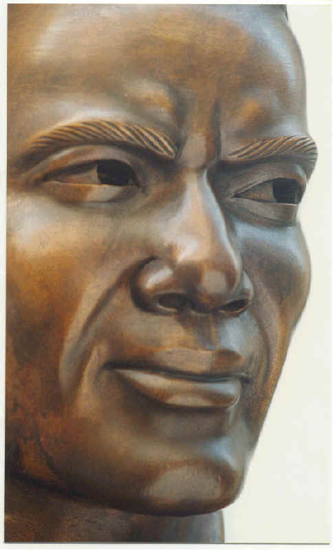 Left: Close-up view of heroic-size bronze bust of Jim Brown.